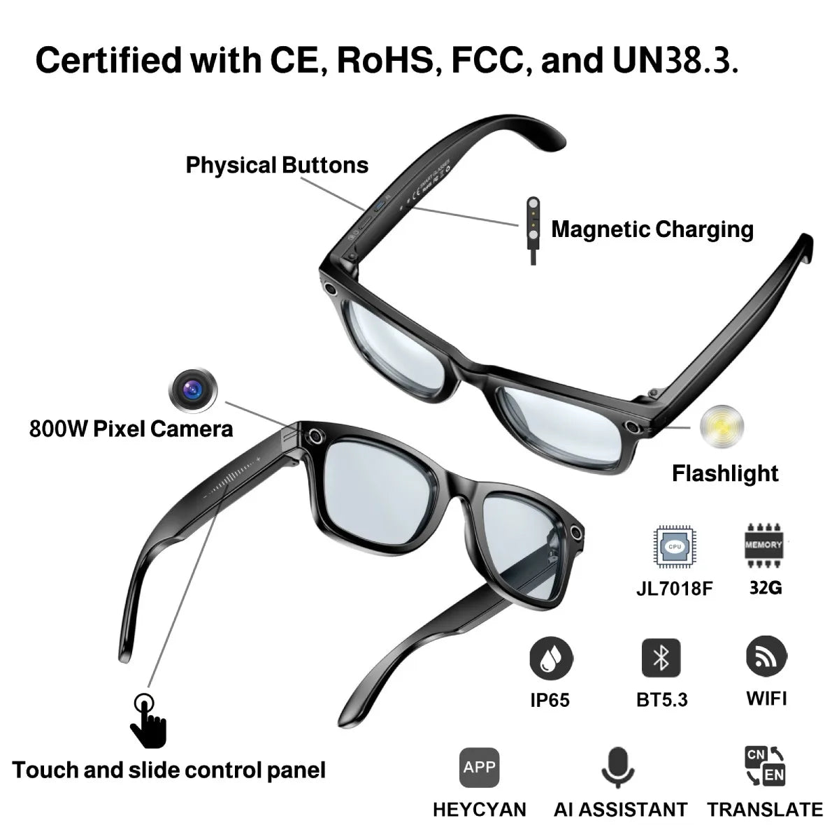Record, translate, and stay connected with smart glasses powered by AI, WiFi, Bluetooth, and a built-in camera.