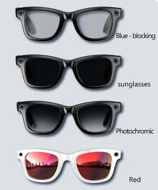 Available in four styles: clear lenses for everyday use, black tinted sunglasses for strong glare reduction, gradient lenses for balanced sun protection, and mirror lenses for enhanced outdoor comfort—all with full smart features included.